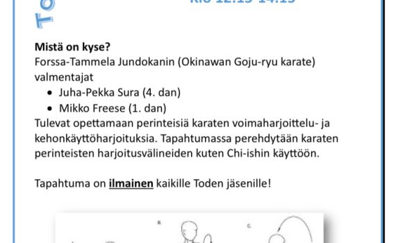 Paikka: Shaolin-dojo, Linnankatu 61, Turku Ohjaaja: Lee Jardine, International Tai Chi Society, Etelä-Afrikan päävalmentaja Ohjelma: Leirillä Lee Jardine opettaa 37-askeleen ja 24-askeleen liikesarjoja. Leiri soveltuu kaikille tai chin harrastajille. Harjoitusajat: Torstai 30.10. klo 17.30 – 20.30 Perjantai 31.10. klo 17.30 – 20.00 Mahdollisuus osallistua omakustanteiseen illalliseen perjantain harjoitusten jälkeen noin klo 21.00. Leirimaksu: […]